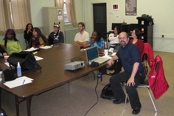 Above: Douglas Kornfeld meeting with the entire Hyde Square Task Force Staff to present his preliminary design for the sculpture to go in Mozart Park.